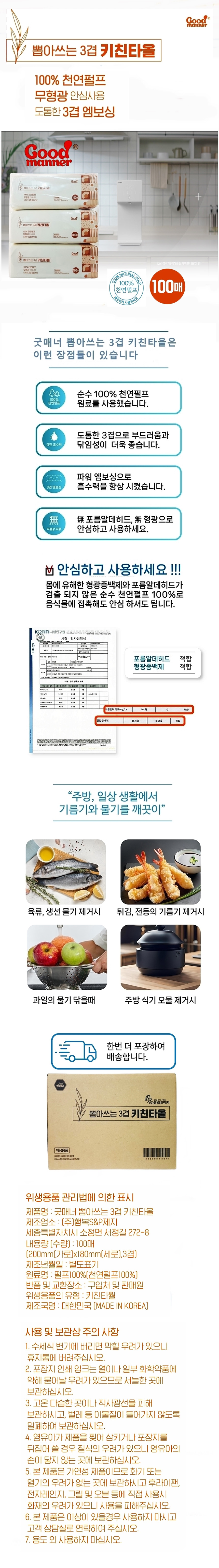 굿매너 뽑아쓰는 키친타올 3겹 (100매× 9팩)