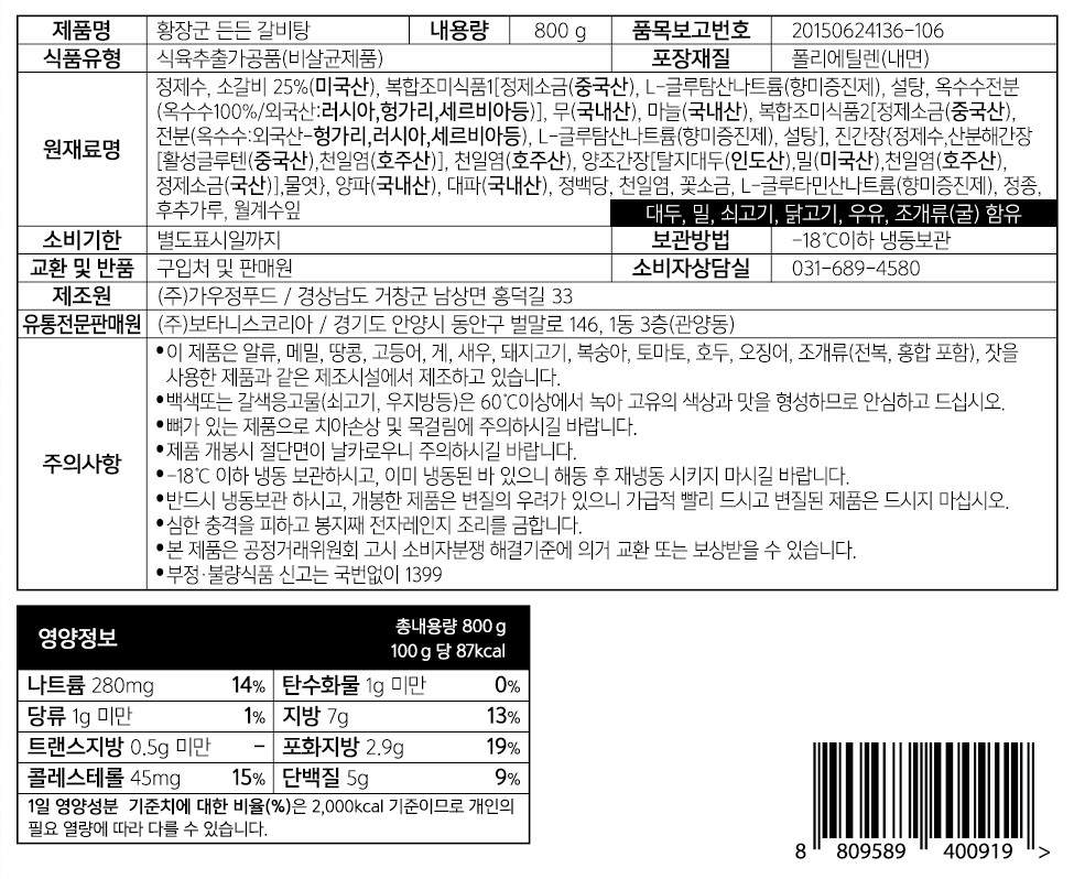 [황씨네옹고집] 황장군 든든 갈비탕 800g x 3팩 (총 2.4kg)